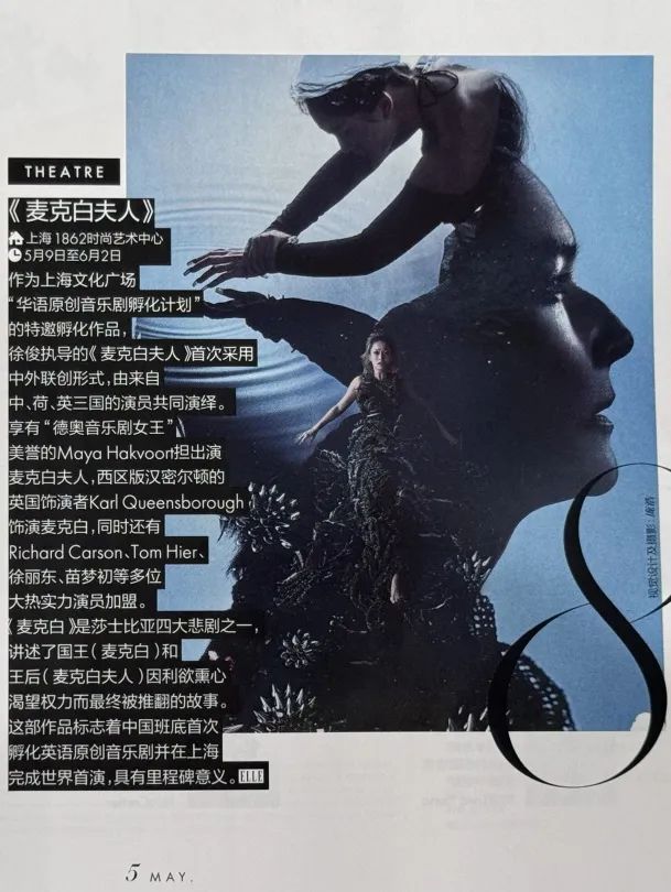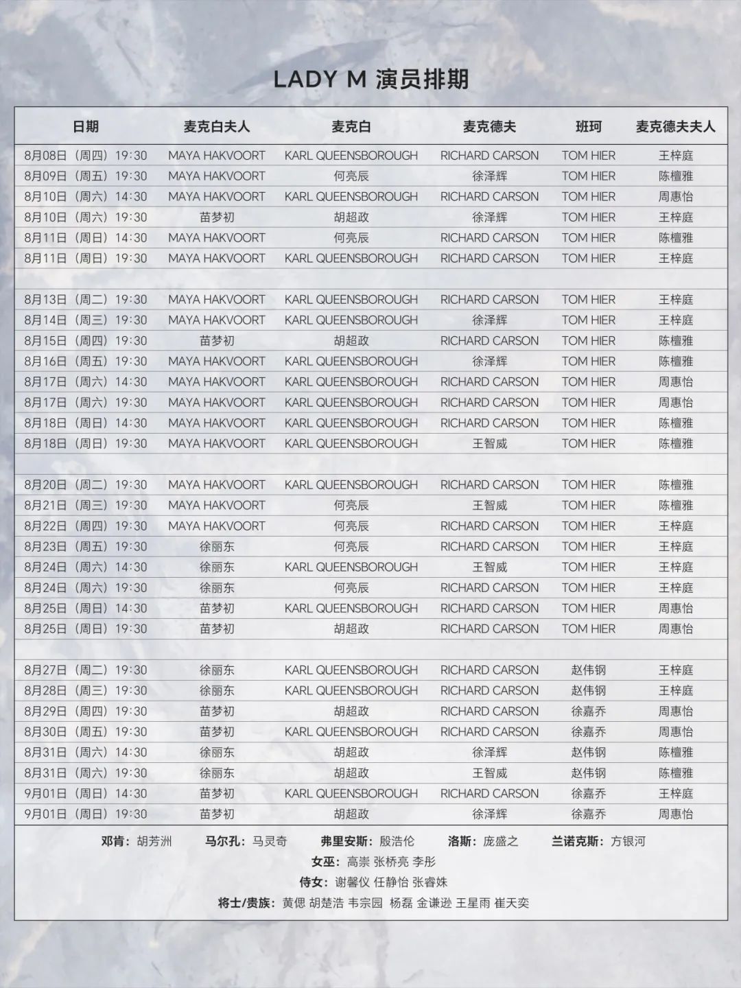 中、荷、英三国卡司全英文全唱式献演。素有“德奥音乐剧女王”之称的玛雅·哈克福特(Maya Hakvoort)将领衔饰演麦克白夫人,华语音乐剧优秀女演员徐丽东、苗梦初也将担纲同一角色。