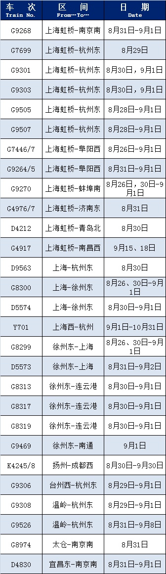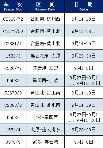 上海铁路客户服务中心介绍,根据旅客出行需求,铁路部门恢复和增开了部分旅客列车,恢复开行列车包括C2369/72(合肥南-杭州西)、C2377/80(合肥南-黄山北)等,增开列车包括G9268(上海虹桥-南京南)、G7699(上海虹桥-杭州东)等,赶快过来看看有没有你需要的车次↓