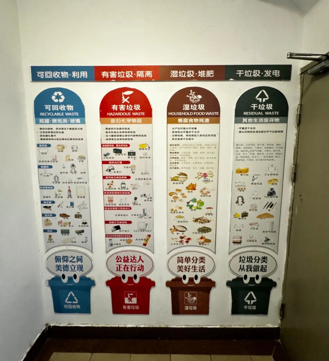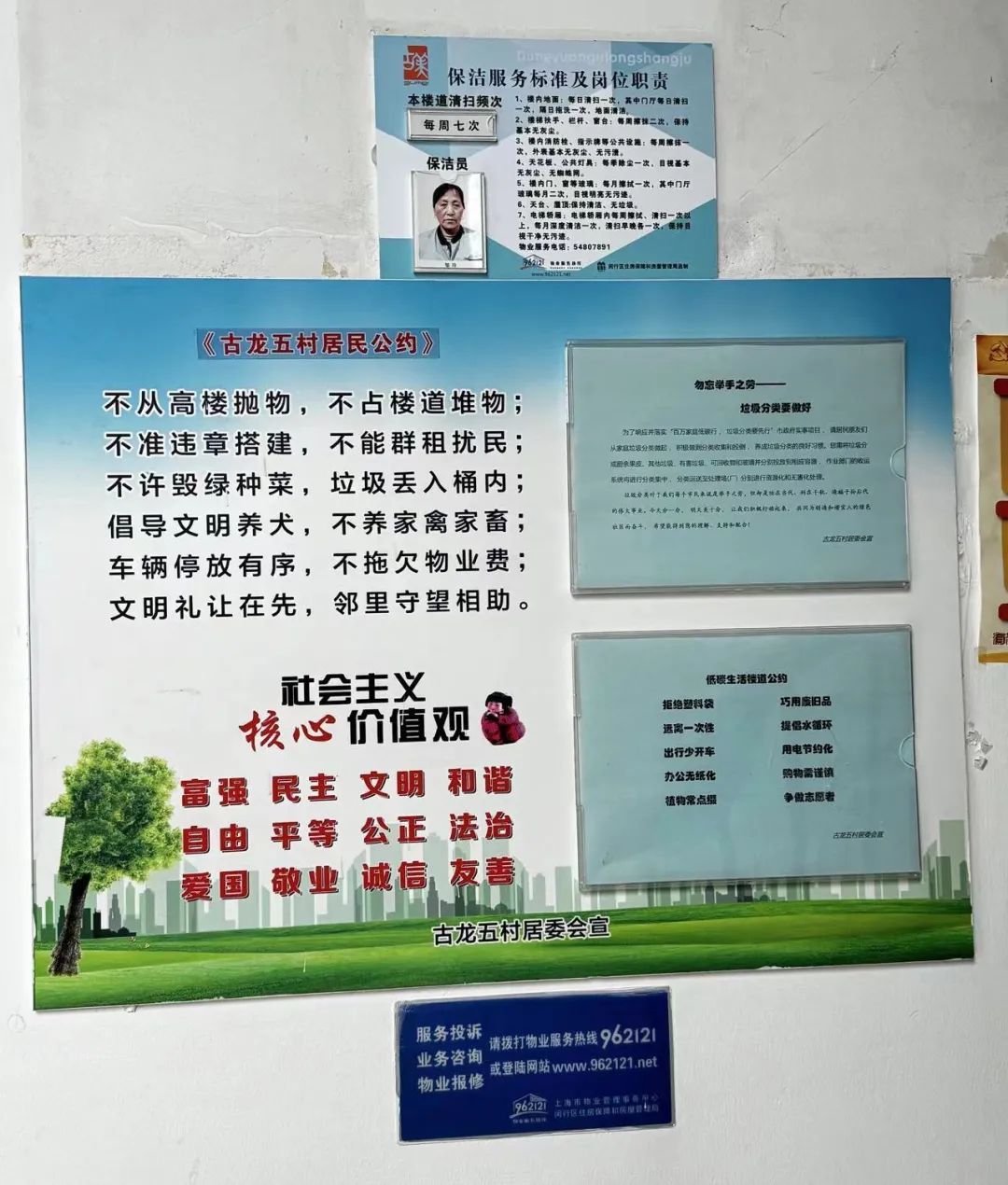 “勿忘举手之劳——垃圾分类要做好”,走进小区楼道里,这样的楼道公约十分明显,居民每次进出都能看到。不仅如此,垃圾分类的要求还写入了小区业主大会议事规则中,其中明确了垃圾分类的标准与方法,还强调了垃圾分类的重要性与意义。古龙五村居民区坚持以党建引领为核心,协调社区居委会、业委会、物业企业以及“业委会和物业工作指导委员会”,搭建“五位一体”协商平台,发挥“四方联动”和“三驾马车”协同机制,成立了业委会和物业垃圾分类指导组,在原有工作措施的基础上,集思广益,创新垃圾分类推广模式。