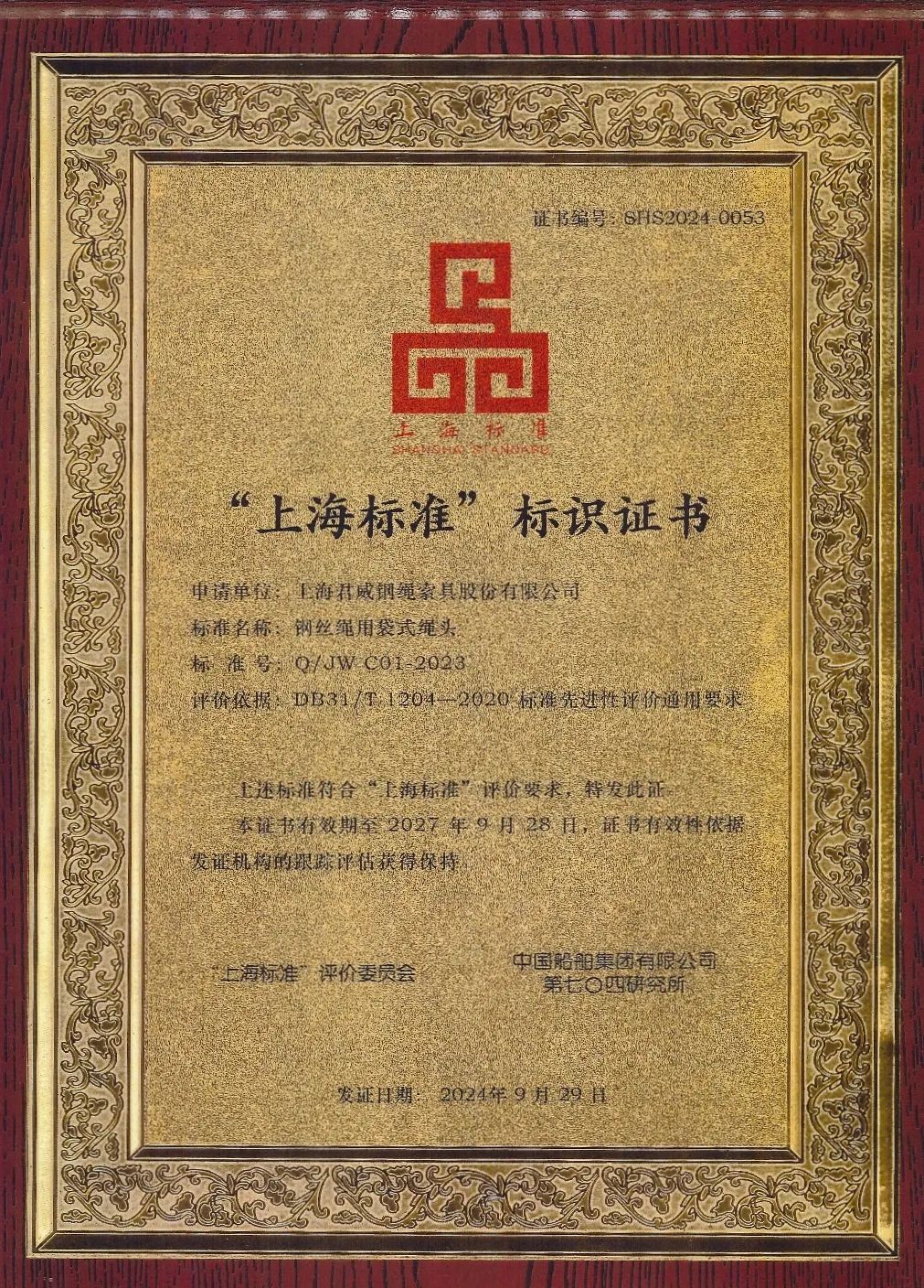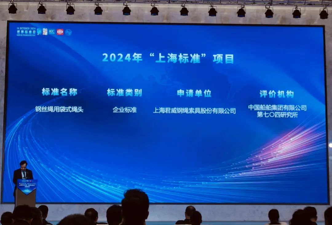 日前,上海市市场监管局组织2024年“世界标准日”主题活动,发布11个“上海标准”。由宝山区市场监管局培育指导的上海君威钢绳索具股份有限公司的企业标准Q/JW C01-2023《钢丝绳用袋式绳头》成功入选。