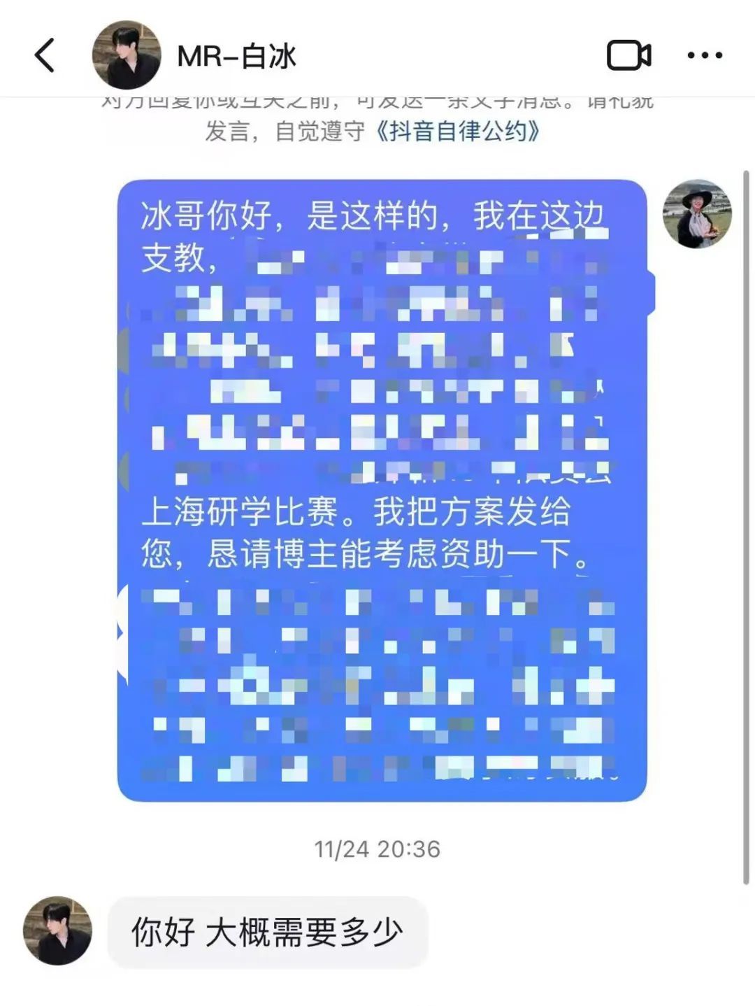 深秋的久治已是大雪纷飞,秦庆轩的内心乱糟糟的。为了缓解压力,他打开视频软件,尝试找一些灵感。没想到,刷着刷着就碰到了以前关注的“MR-白冰”博主。“他因为视频独具创意加上热心公益,挺受年轻人喜爱,如今已经拥有4100多万粉丝,那么为这群山区孩子实现愿望的想法会得到他的回应吗?”想到这里,秦庆轩猛地从床上坐了起来,精心编辑求助文案,点击发送。虽然知道机会渺茫,但秦庆轩还是把平台提示音打开,把手机音量调到最大,生怕错过任何回复。