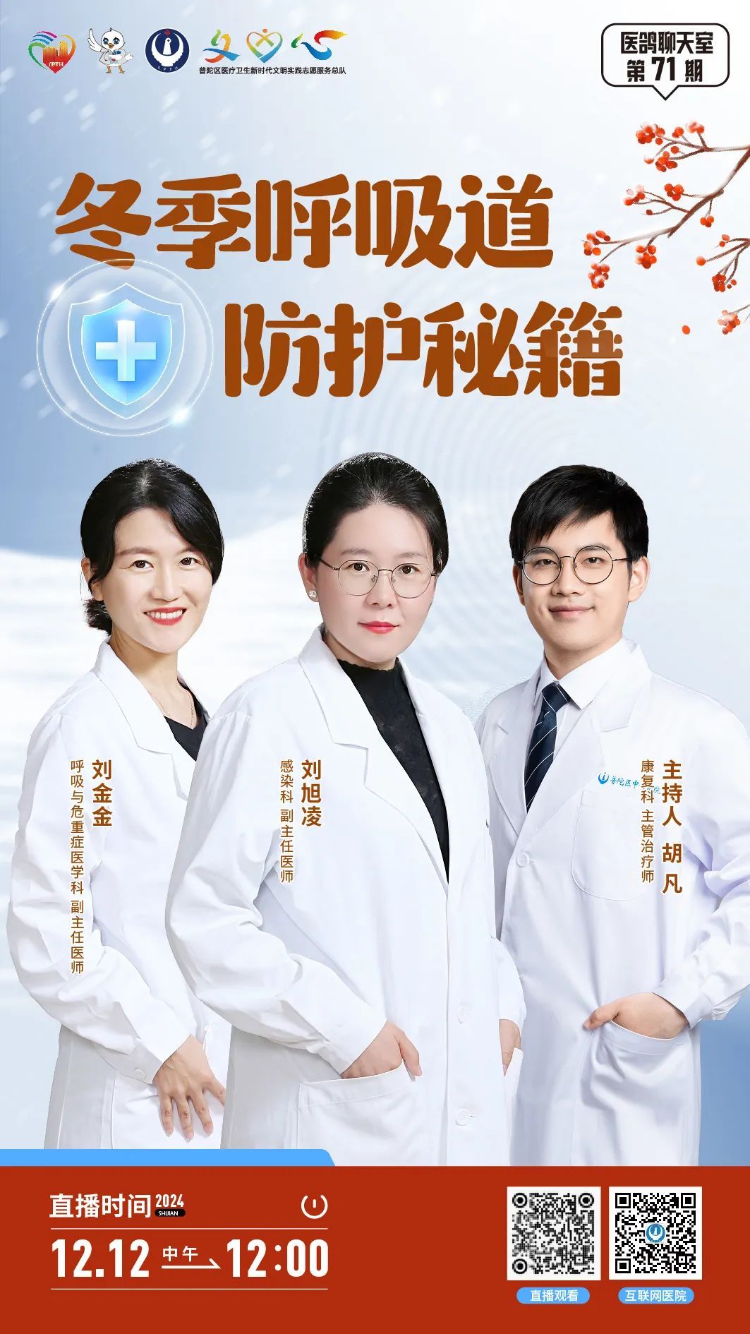 12月12日(周四)12:00,普陀区中心医院5G健康直播间将以《冬季呼吸道防护秘籍》为主题,由感染科副主任医师刘旭凌、呼吸与危重症医学科副主任医师刘金金、康复科主管治疗师胡凡搭档,带大家一起了解冬季如何保护自己的呼吸道!观众朋友们,让我们不见不散~