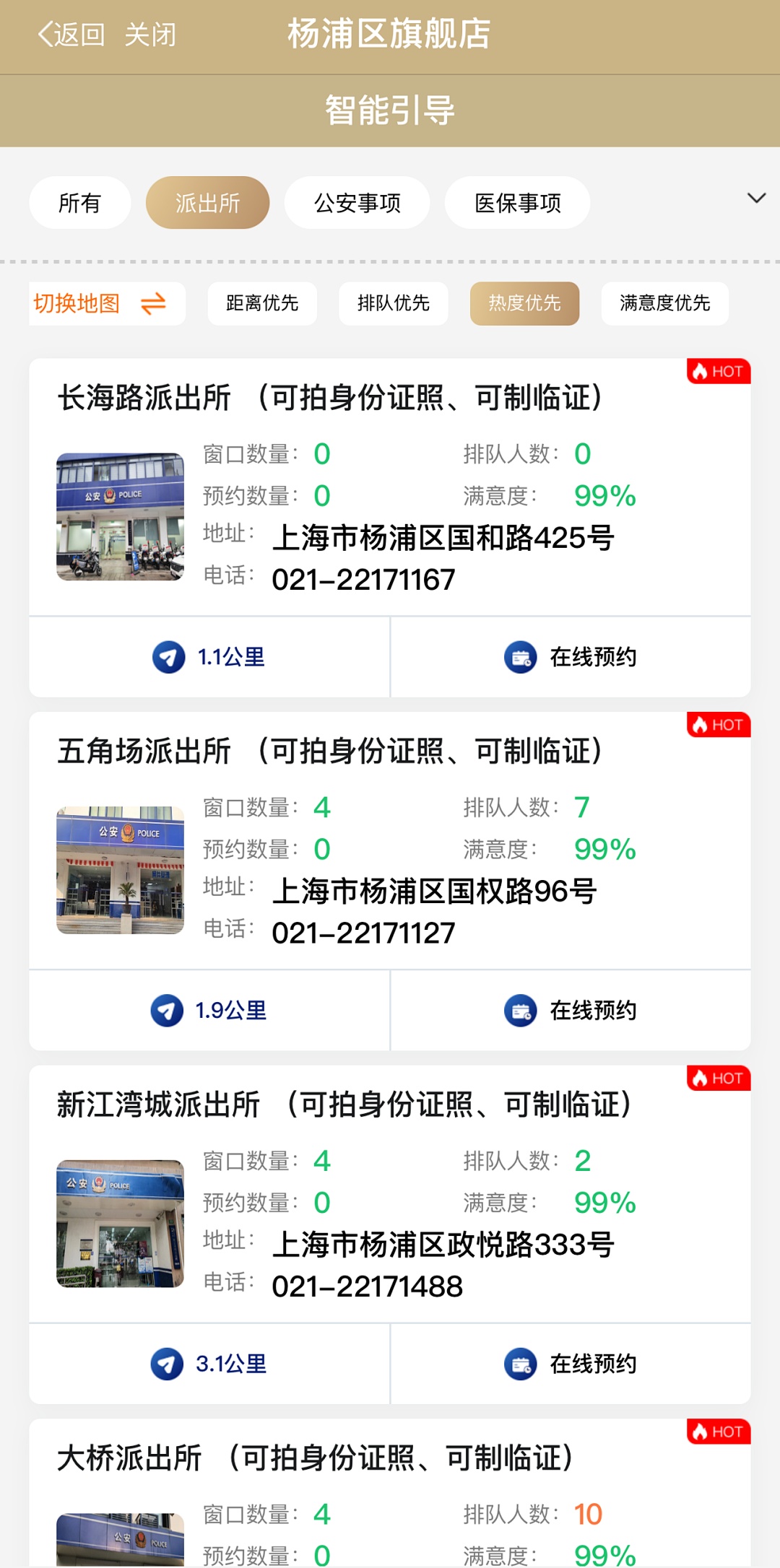 记者从杨浦公安分局人口办了解到,市民在换证前可先通过派出所综合大厅业务办理“热力图”来判断去哪家派出所最便捷、最省时。市民只需打开“随申办”APP内的“杨浦旗舰店”,就能分级分色实时掌握杨浦13家户籍派出所窗口排队人数、窗口地址、联系电话、距离远近等信息。