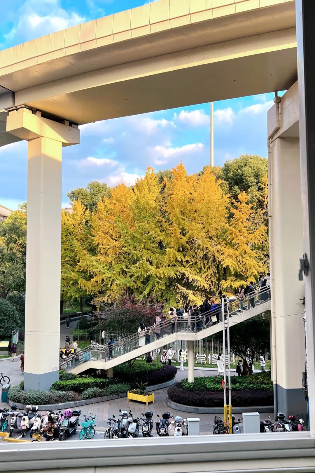 眼下,从2号口迈出,成片的银杏林便映入眼帘,而出口处的人行天桥,便是最好的银杏观景平台。