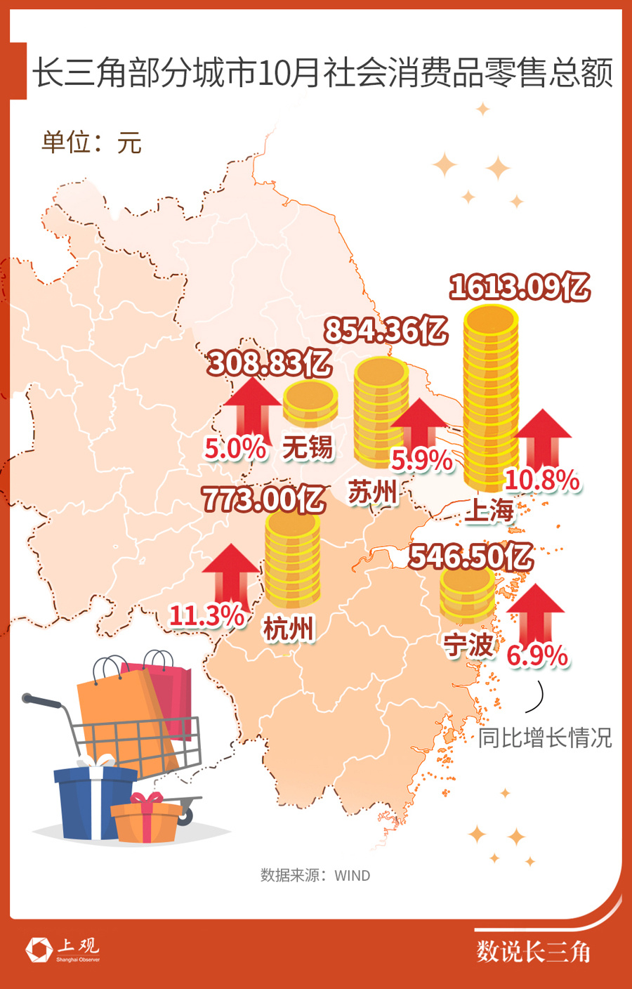 近期长三角各地社会消费品零售总额增长形势向好。十月消费券发放重地上海和杭州社会消费品零售总额都取得了两位数增长。