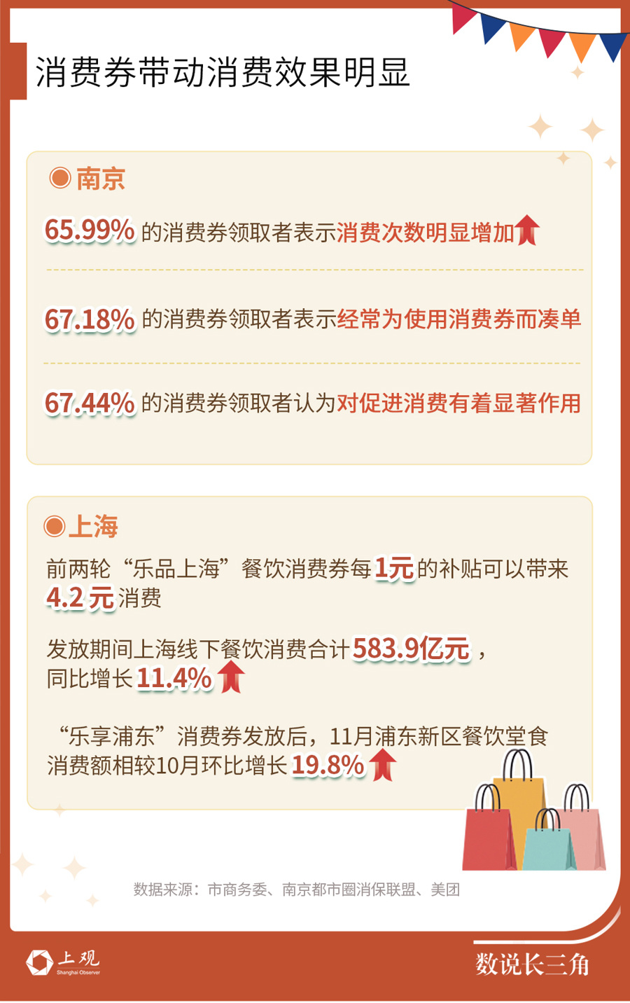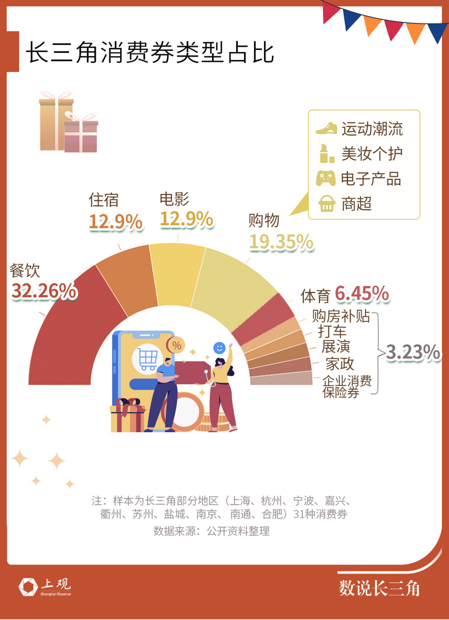 今年以来,长三角各地都频频发放消费券。记者盘点了包括上海、杭州、宁波、嘉兴、衢州、苏州、盐城、南京、南通、合肥等10个城市目前在发的32种消费券,其中,餐饮消费券占比最多、其次是购物、住宿和电影、体育消费券。消费券刺激下,消费增长明显,长三角地区社会消费品零售总额增长形势向好。