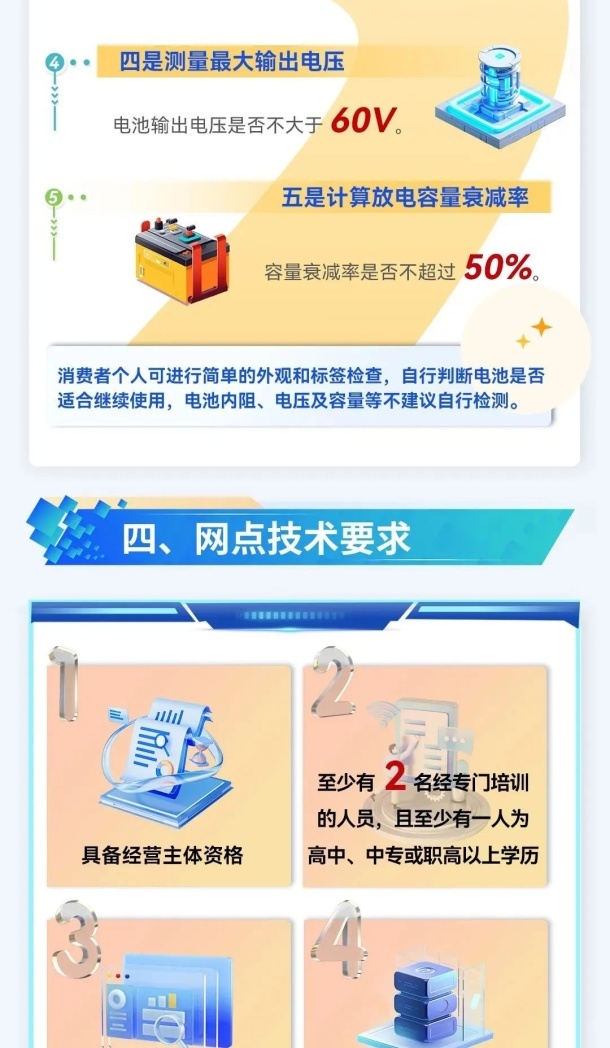 (四)公共充电柜、充电桩运营商可在相关充电设施中内嵌电池健康评估服务功能,对进行充电的电池开展内阻、最大输出电压、放电容量的检测,并向充电用户提供是否建议继续使用的参考建议,由用户自行决定是否报废。
