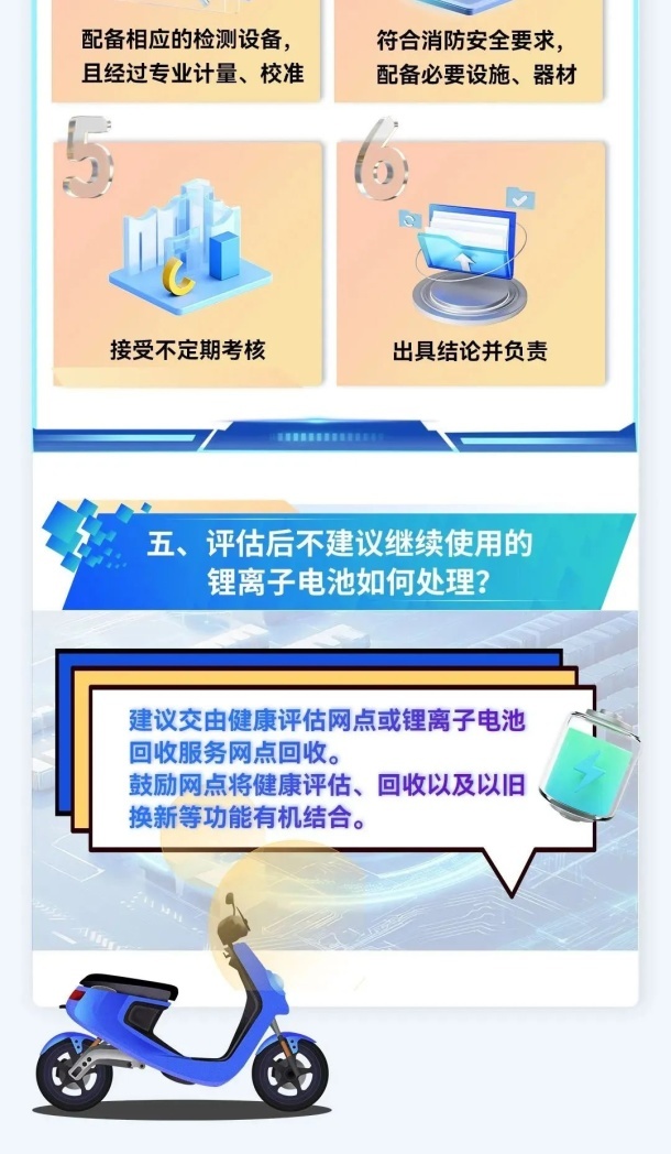 (三)电动自行车和锂离子电池生产、销售企业、售后服务网点以及其他第三方机构等,可依据《健康评估指引》,通过配备相应的评估设备及专业技术人员,以社会化的方式为消费者提供电动自行车用锂离子电池健康评估服务,所出具的健康评估结论可作为报废参考,不作为判定依据。