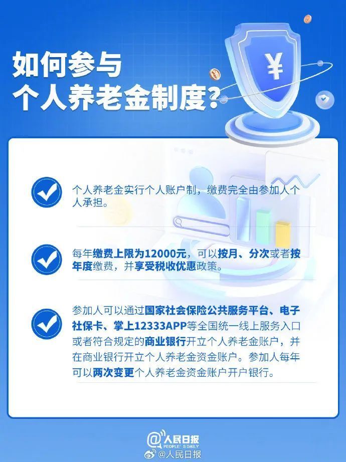 个人养老金制度,指政府政策支持、个人自愿参加、市场化运营、实现养老保险补充功能的制度,是中国养老保险体系“第三支柱”的重要制度设计。参加人每年缴纳个人养老金的上限为12000元,可以通过国家社会保险公共服务平台、电子社保卡、掌上12333APP等全国统一线上服务入口或者符合规定的商业银行开立个人养老金账户,并在商业银行开立个人养老金资金账户。每年可两次变更个人养老金资金账户开户银行。