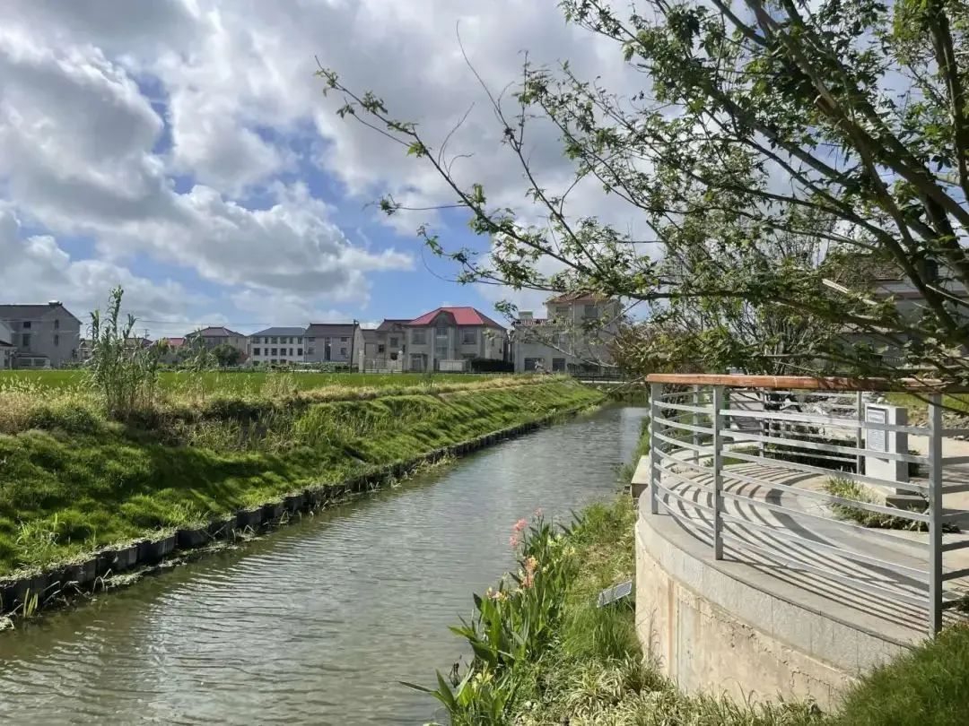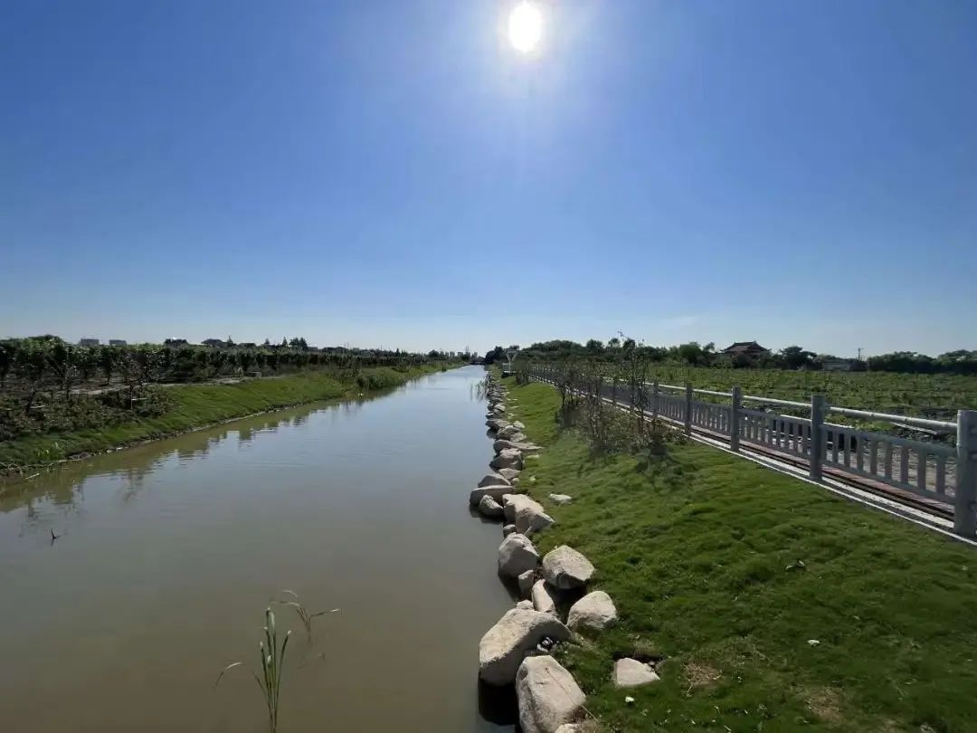 成日村4组9号河是成日村和新如村的界河,大部分位于新如村。通过整治提升了河道水质,增强区域水动力,减少岸坡水土流失,进一步提升了区域防汛排涝功能。同时,依托农业产业园已种植果树资源基底,配合近期农业园休闲农旅建设,通过人行桥和路网串联出慢行系统网络,滨水设施设计突出果飘香主题,与农业产业园元素呼应,增强景观体验趣味性,成为“收获水岸”打卡点。