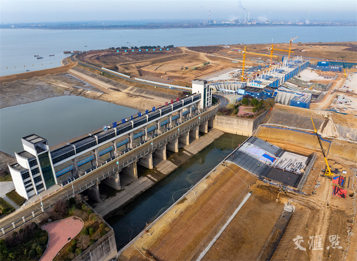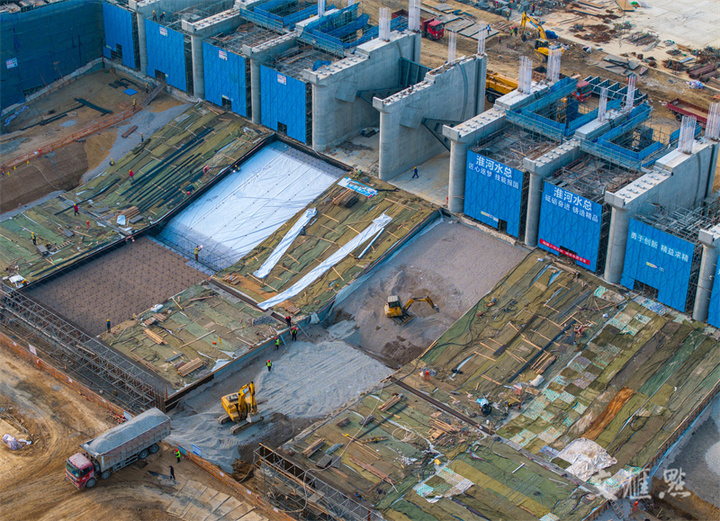 12月14日,淮安市,建设者在淮河入海水道二期工程二河枢纽入海水道进洪越闸工地上忙碌。经过一年的紧张施工,淮河入海水道二期工程二河枢纽入海水道进洪越闸主体工程初具雏形。贺敬华/摄 视觉江苏网供图