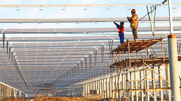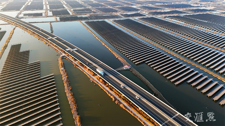 12月14日,工作人员在连云港市赣榆区墩尚镇940兆瓦渔光互补光伏发电项目现场加紧施工。近年来,连云港市依托沿海地理优势和丰富的光照条件,充分利用盐碱地、荒地、企业房顶、海边滩涂等有序开发建设太阳能光伏发电项目,助力绿色低碳发展。耿玉和/摄 视觉江苏网供图