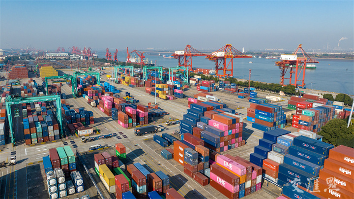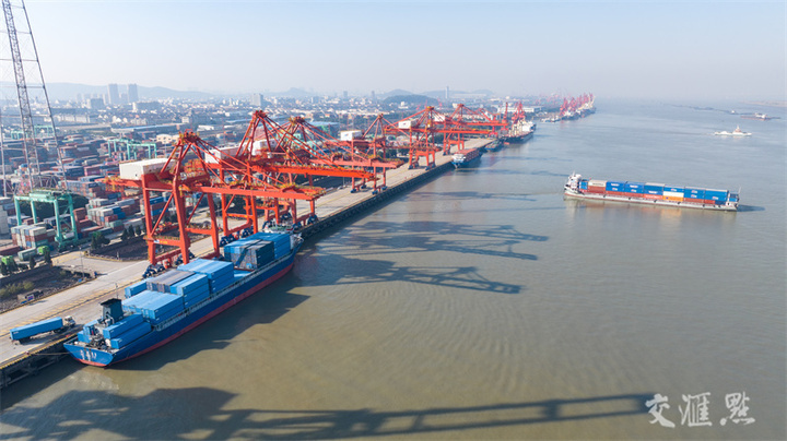 12月16日,在张家港永嘉集装箱码头,港口吞吐作业一派繁忙景象。进入年末,永嘉码头铆足干劲忙生产,全力冲刺“全年红”,今年1月到11月,永嘉码头完成集装箱吞吐量768018标准箱,同比增幅11.67%。陈佳琪/摄 视觉江苏网供图