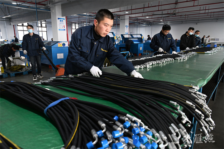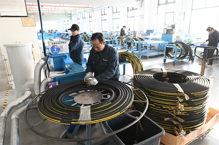 12月16日,太仓市濂辉液压器材有限公司的生产技术人员正在生产机械设备液压胶管。据了解,该公司主要从事液压管总成的研发与生产,配套挖掘机、数控设备、精密磨床等各种机械设备,目前月均产量达30万套。计海新/摄 视觉江苏网供图