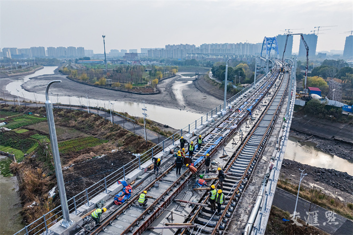 12月11日,在南京至马鞍山市域(郊)铁路江宁镇站至牧龙站区间段施工现场,施工人员正在铺设铁轨线路,加快铁路施工建设。新华日报·交汇点记者 蒋文超/摄