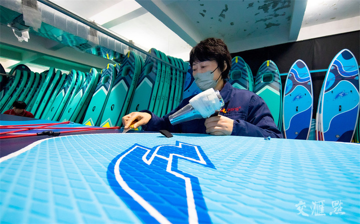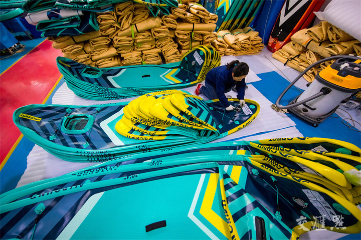 12月15日,泗洪县金锁镇,工人在吉龙运动休闲用品有限公司生产车间,加紧生产出口的冲浪板订单产品。近年来,该公司通过产业整体转移、技术研发,成功转型为高新技术企业,产品销往近五十个国家和地区。李佳/摄 视觉江苏网供图