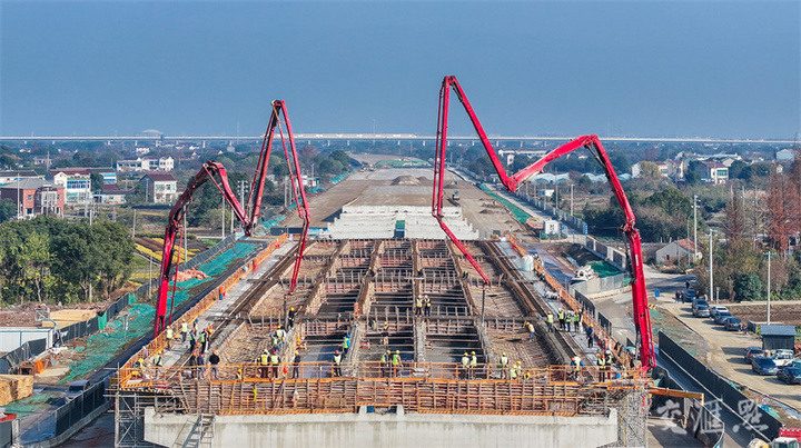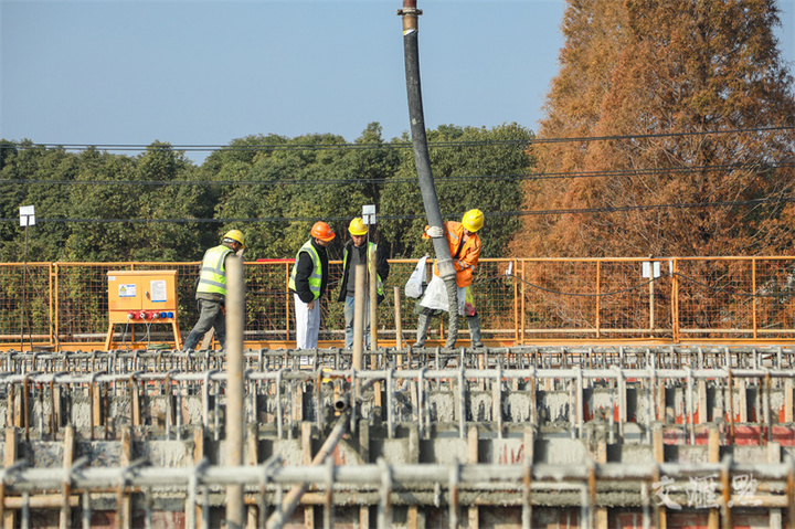 12月12日拍摄的常州花海大道(延政西路—湟村线)工程现浇箱梁首件施工现场。目前,常州花海大道(延政西路—湟村线)工程项目正全力推进路基桥梁施工。王锐/摄 视觉江苏网供图