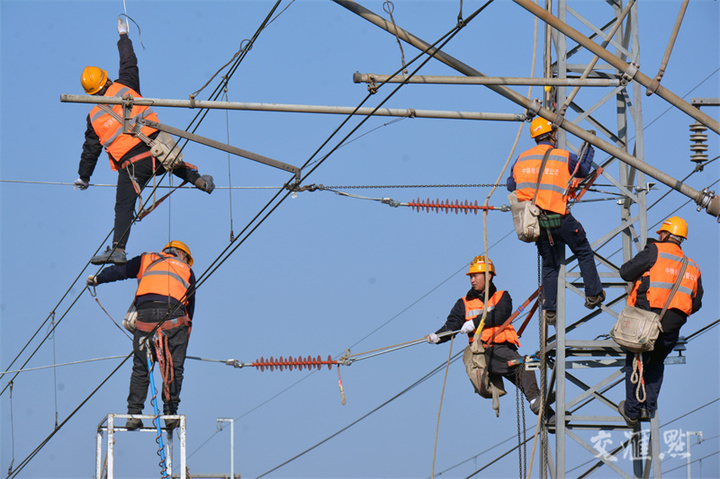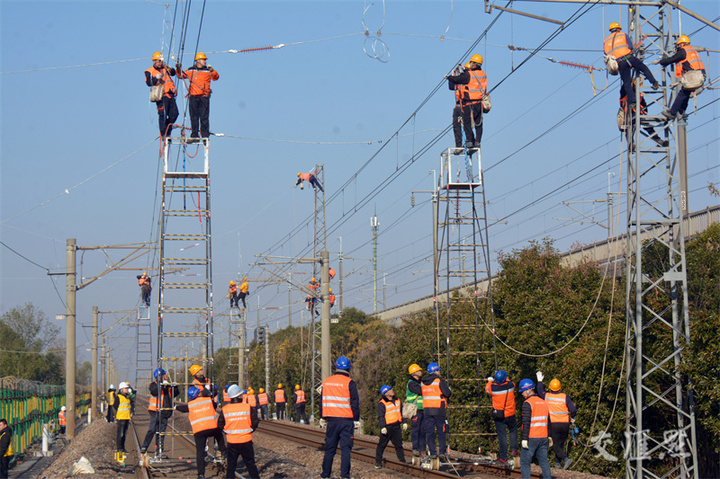 12月16日,常州市新孟河延伸拓浚工程京沪铁路吕城至奔牛段接触网改造施工现场,工作人员正在高空架设接触网软横跨,全力推进工程施工进度。据了解,新建线路地段将进行接触网基础制作135处、支柱组立122根、附加导线架设6.84条公里、承导线架设10.8条公里。杜希昊/摄 视觉江苏网供图
