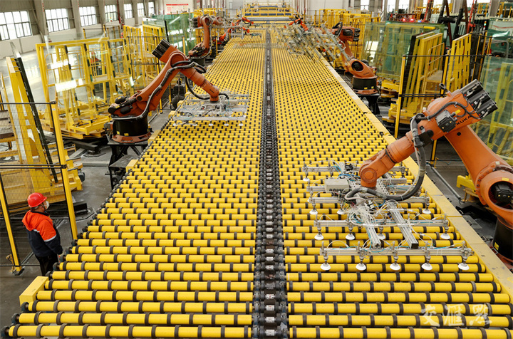 12月12日,宿迁市宿豫区,工人在江苏苏华达新材料有限公司浮法玻璃生产线忙碌,机械手取片系统在自动堆垛玻璃,一派繁忙的生产景象。王力/摄 视觉江苏网供图