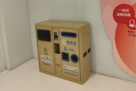 此外,商场还将废物箱升级改造为精细化分类废物箱,并醒目设置投放分类指引,引导顾客将玻、金、塑、纸等可回收物进行分类投放。