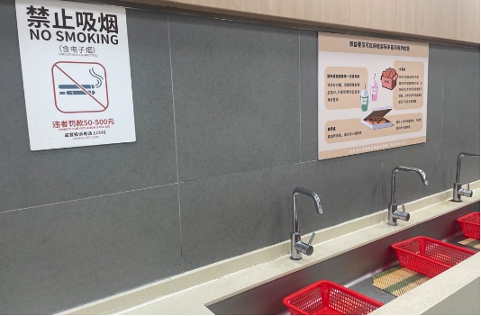 员工洗手台旁,更是贴心设置了塑料餐盒和饮料瓶回收篮,从源头上实现了更精细化的分类回收。