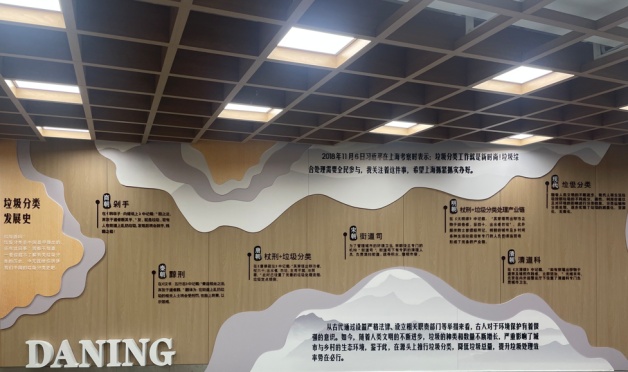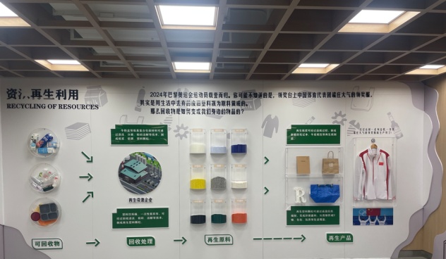 大宁久光商场在员工餐厅打造了垃圾精细化分类宣传墙,介绍垃圾分类发展史,同时聚焦2024年奥运会运动员球衣的循环之旅——从回收处理,到转化为再生材料,制成再生产品,生动诠释了无废理念从古到今的创新实践与无限可能。