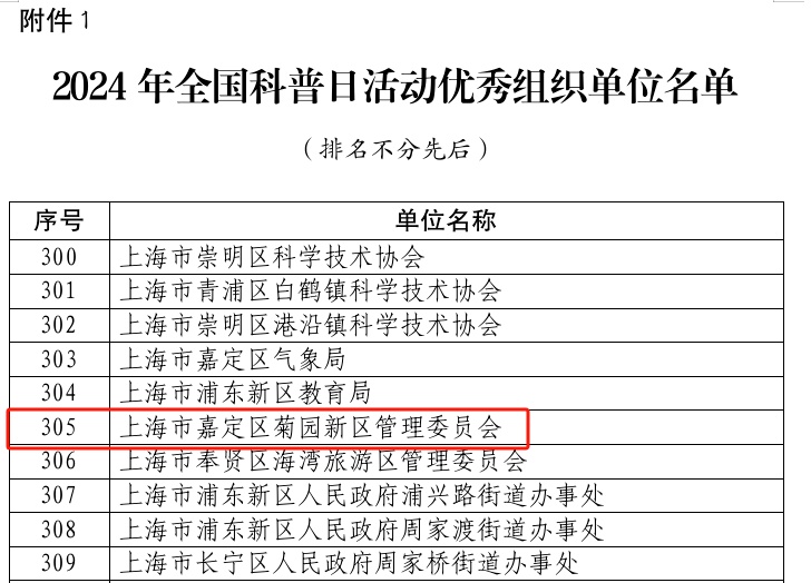 日前,中国科学技术协会发布《中国科协办公厅关于对2024年全国科普日有关组织单位和活动予以表扬的通知》,其中,上海市嘉定区菊园新区管理委员会被评为2024年全国科普日活动优秀组织单位。
