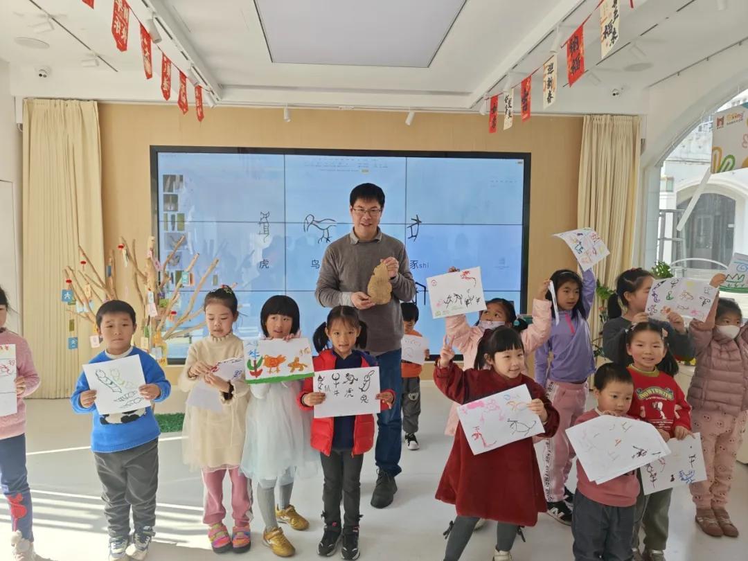 “猜猜这是什么动物”的游戏环节激发了小朋友们浓厚的兴趣。“这是‘老虎’的‘虎’字!”“这只鸟嘴巴好长呀!”“这个图案旋转90度很像一头肚子圆滚滚的猪!”小朋友们七嘴八舌地分享着自己观察到的信息。刘良鹏对小朋友们说道:“通过甲骨文,我们可以了解沧海桑田的变迁。殷墟发现的甲骨文就像我们今天写的日记,为深入研究中国古代文明提供了珍贵的史料。”