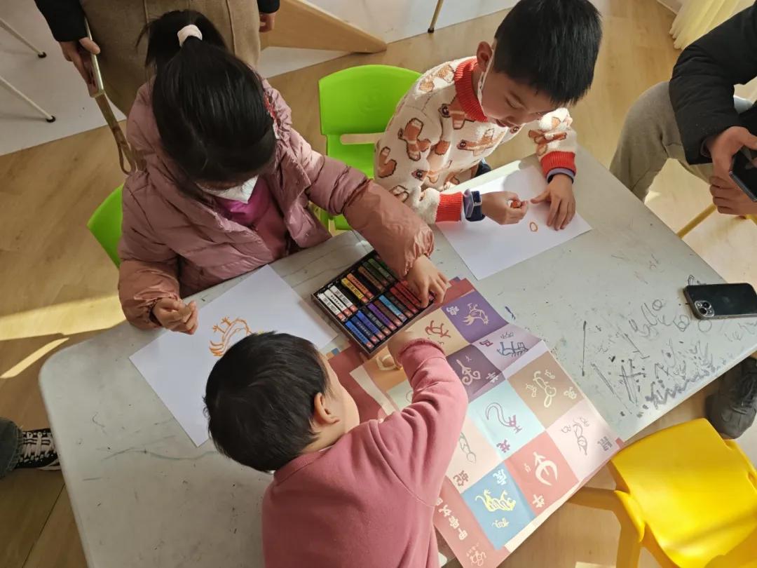 小朋友们抚摸着甲骨模型上密密麻麻的象形字,在老师和家长的鼓励下猜十二生肖的甲骨文,并参照彩色甲骨文对照卡片,在白纸上画甲骨文版十二生肖,描绘心中人与自然和谐共生的美好图景。