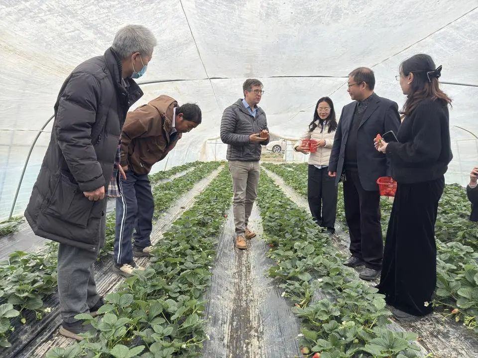 (图为美国北卡罗来纳州立大学Mark教授、上海市农业科学院草莓首席专家高清华研究员、浙江农林大学农业与食品科学学院副院长张传清教授一行调研新桥村草莓种植产业)