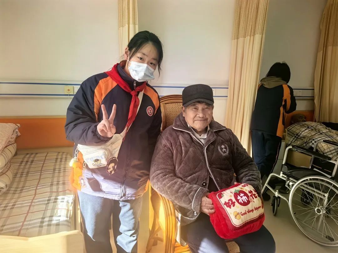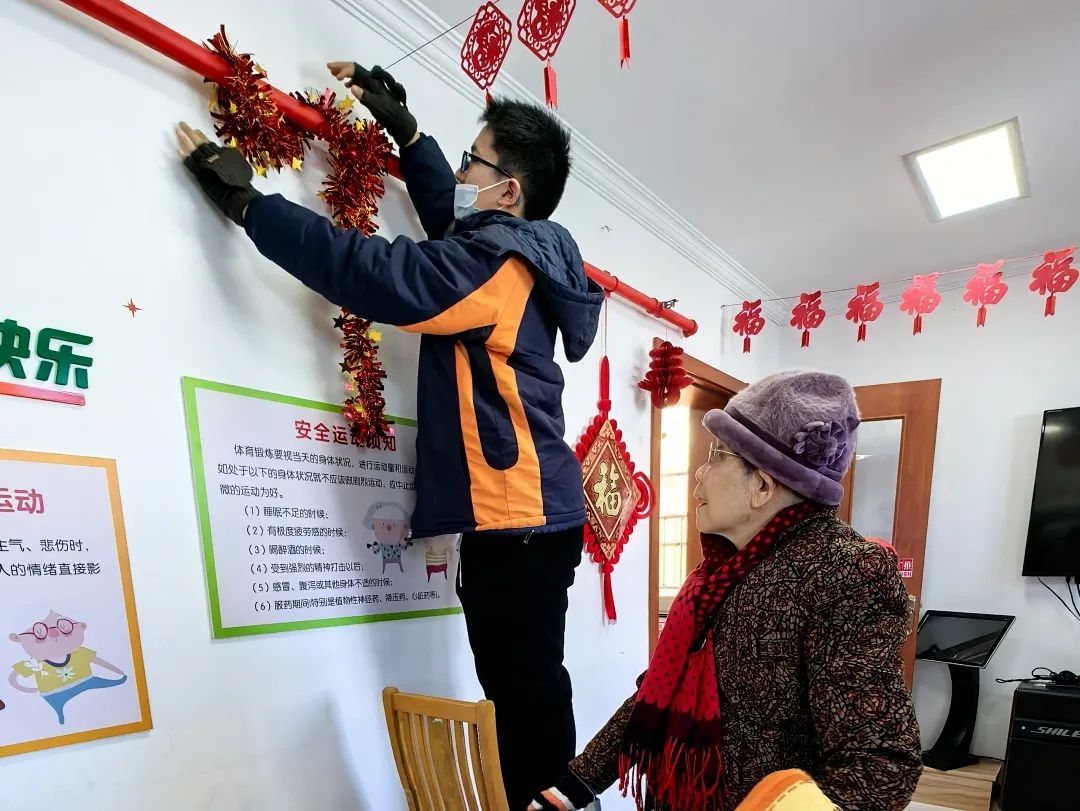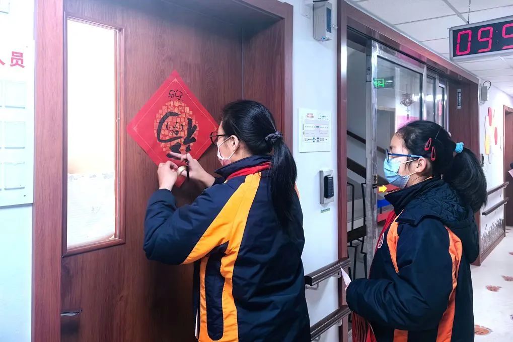到敬老院看望、关爱老人是每年寒假的传统活动。当天,师生团队来到长海路街道一处党群服务中心,一起写“福”字、祝福卡片、制作灯笼,将这些亲手制作的暖心礼物送给老人。有人在活动室挂上彩带与灯笼,有人在老人们居室的门上贴“福”字,大家齐心协力,点“靓”了敬老院的每一个角落。还有学生将暖手抱枕和自己亲自书写的新春贺卡送到老人们的手中,收获了爷爷奶奶们高兴的笑容。