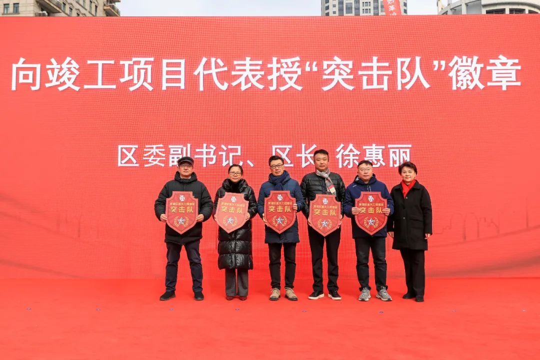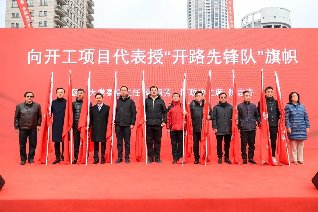 仪式上,区人大常委会主任韩顺芳和区政协主席陈志奇为嘉里建设集团卓颢置业有限公司、城市发展中国有限公司、上海金心置业公司、上海城投置地公司、久事集团新圆坊置业公司、区绿化市容局、上海新世界集团新丸公司、永业集团、新黄浦实业集团公司、区市政工程管理所等10个新开工项目代表授“开路先锋队”旗帜;区委副书记、区长徐惠丽为香港新世界集团新世代淮中商业发展有限公司、上海鼎霖房地产开发有限公司、区文化旅游局、南房集团、区市政工程管理所等5个竣工项目代表授“突击队”徽章;区委常委、副区长徐知通报并部署2025年全区重大工程建设推进工作。
