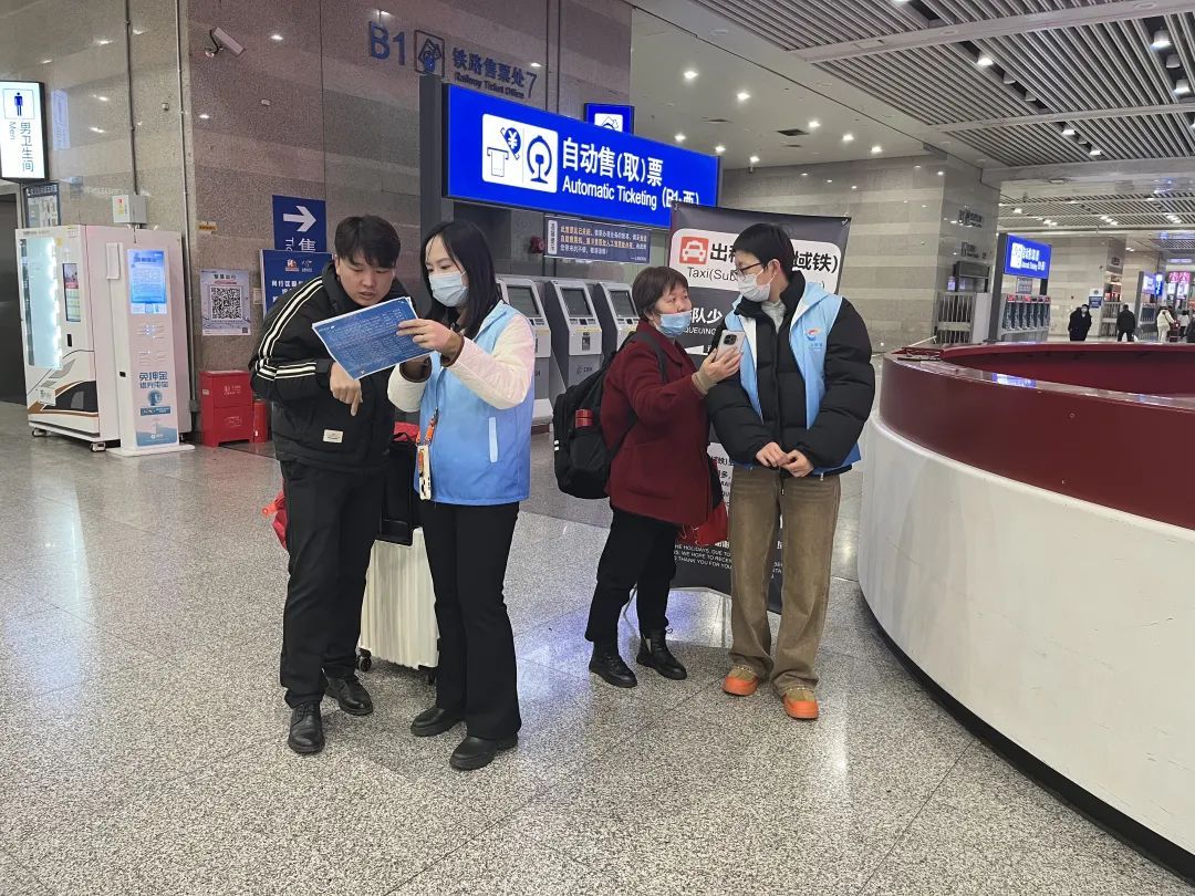 “小乐别哭,我们帮你找爸爸!”张黎炜一边安抚孩子,一边通过微信群联动其他志愿者,一旦有人询问找孩子就向自己这边指引。同时,他让小乐用自己的充电宝为智能手表充电,还递上热水和零食,用轻松的聊天缓解他的紧张。半小时后,通过一路上志愿者的指引和小乐电子手表的定位功能,父子俩在志愿者服务点重逢,这位父亲紧握张黎炜的手,声音哽咽:“谢谢!谢谢!要不是你们,我真不知道该怎么办……”“小伙子,能来帮帮我吗?我这个票出不来怎么办?”一位老太太在自助售票机前手足无措,向虹桥镇规建办志愿者余杰寻求帮助。经询问,原来是她和老伴想乘坐地铁,但身上只有老人机的他们无法线上购买地铁票,在现场买票时发现投入了硬币却没有出票。余杰一边安排老先生现场看好购票机,一边带着老太太找到最近的地铁服务中心寻求帮助。经过工作人员的帮助和余杰的沟通,他们买到了地铁车票,顺利坐上了地铁。临走时,他们对余杰说“谢谢你小伙子!”听到这朴实的话语,余杰更加明白志愿服务的意义。在这个春运返程高峰,虹桥镇的“蓝精灵”们用他们的爱心、耐心和责任心,为旅客们的回家路增添了一份温暖和保障。他们的身影穿梭在人群中,如同点点星光,不断传递“申城温度”和闵行热情。