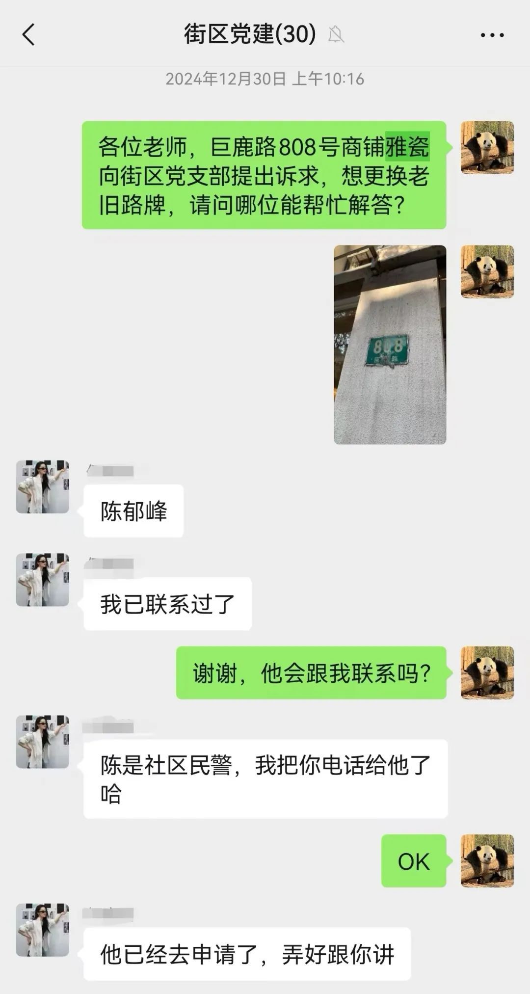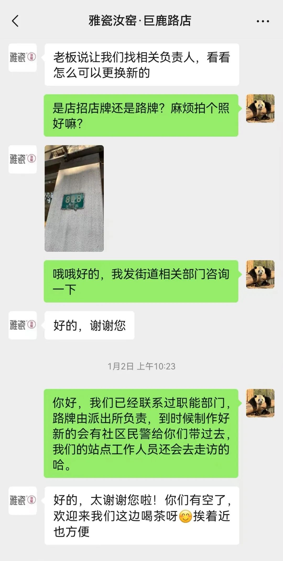 一天,巨鹿路808号的商户雅瓷给王臻打来电话:“我们门牌旧得看不清字了,怕大家找不到我们,请问可以联系哪个部门申请换牌啊?”接到电话后,王臻立即在街区党支部的工作群里为雅瓷寻求帮助。通过微信群的高效沟通,在街道后援团的协助下,属地社区民警迅速响应,及时帮助他们完成门牌换新工作。