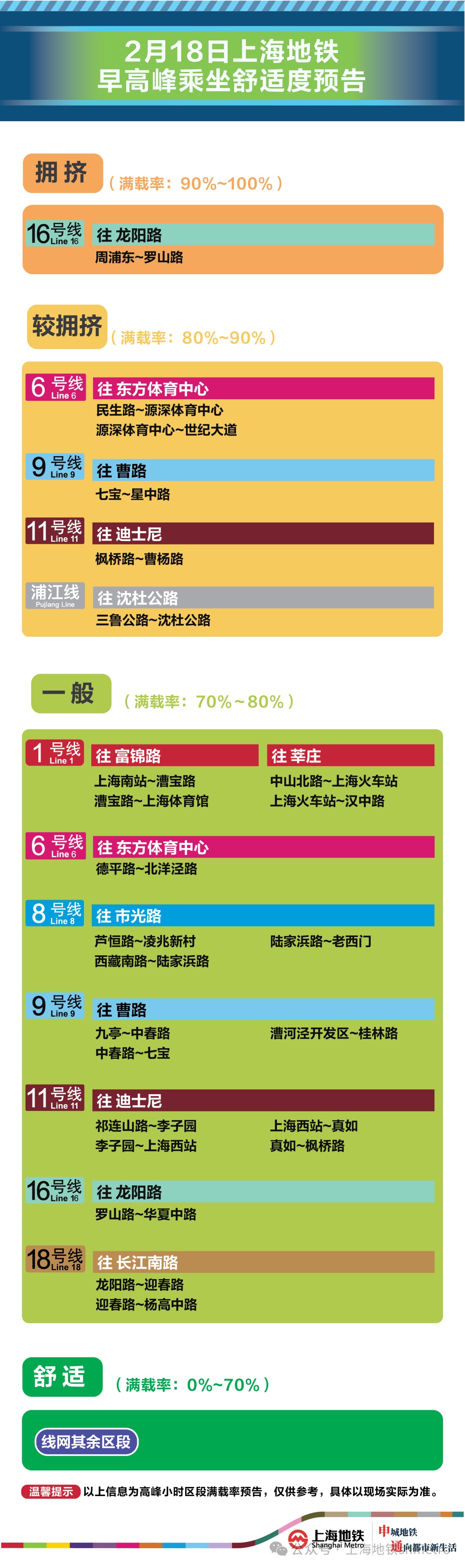 为提升上海地铁早高峰期间出行服务水平,提升乘客乘坐体验,上海地铁向乘客提供乘坐舒适度预告,方便乘客提