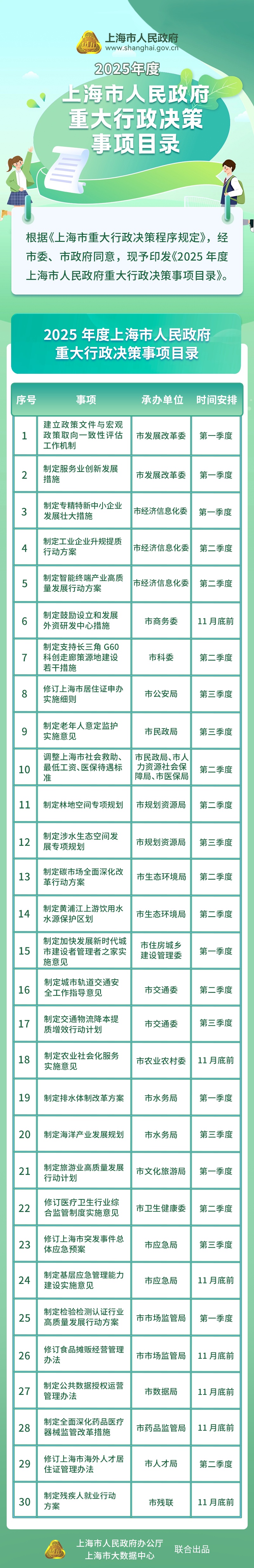 为落实重大行政决策程序制度,上海市人民政府办公厅编制了《2025年度上海市人民政府重大行政决策事项目录》,内容包括制定服务业创新发展措施、交通物流降本提质增效行动计划等。详见↓