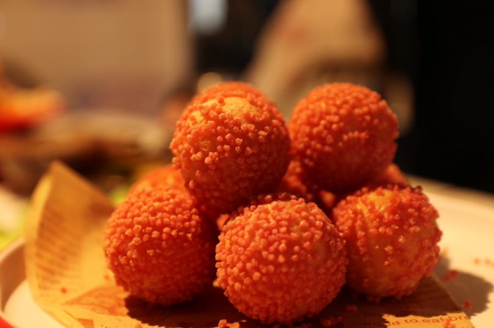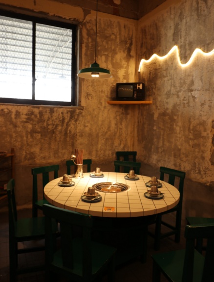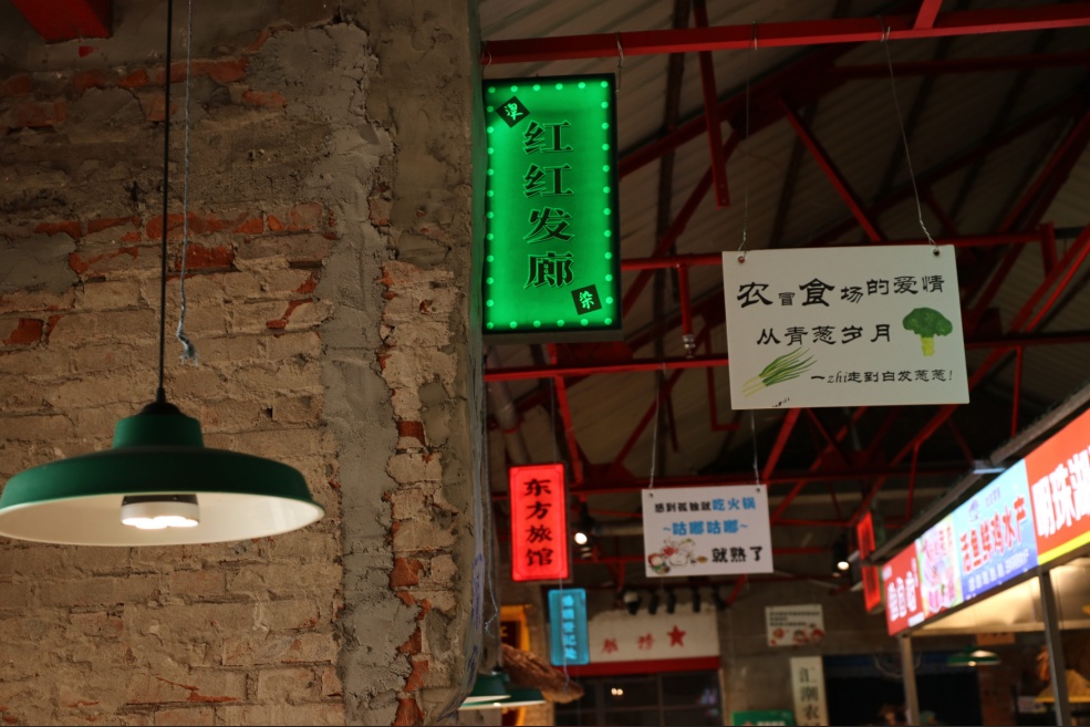 大堂悬挂着各式各样的彩色招牌,用来围挡的砖墙历经岁月洗礼,早已磨去了尖锐的棱角,墙上隐约可见的广告图案仿佛是小时候的记忆。黄色的灯光,鲜艳的餐桌,复古的藤椅,它的每一个角落都散发出迷人的魅力。