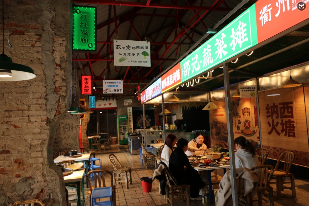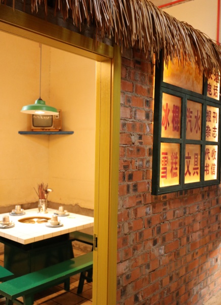 最绝的是座位——在印着“冰棍”、“文具”、“代收书信”的红砖围墙下,搬一把竹矮凳,坐下瞬间解锁“围着灶头等开饭”的童年体验。