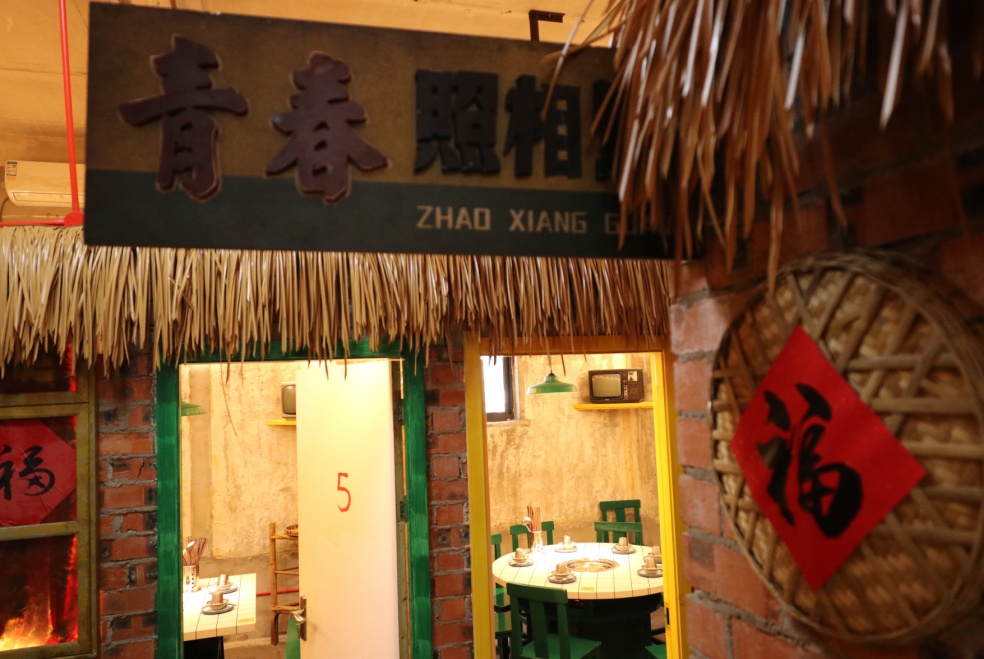 掀开蓝印花布门帘,70年代的气息糊你一脸:红砖墙贴着泛黄的《小虎队》海报,竹编顶棚吊着嘎吱响的煤油灯,供销社淘汰的木头货架成了食材展示柜。