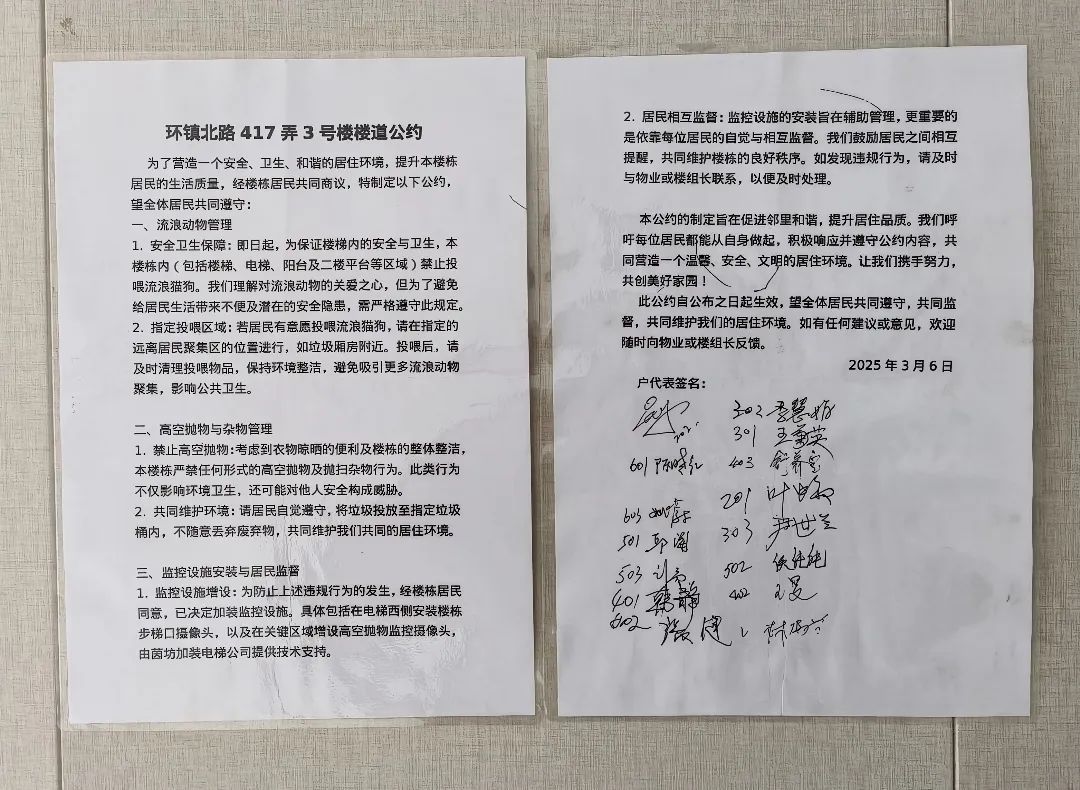在党总支指导下,居民会议审议通过了楼道公约,公约内容涵盖流浪猫固定投喂地点、方式,对高空抛物问题,居民轮流担任“观察员”,鼓励互相提醒,同时加梯公司提供技术支持安装监控设施,保障监督效果。居民公约的制定,使问题解决有章可循,避免了后续可能出现的争议,极大地提高了居民参与的积极性与主动性。居民们纷纷签字,承诺共同遵守、互相监督。这不仅是对规则的认可,也是对邻里情谊的珍视。随着公约的生效,楼下居民终于放下了心中芥蒂,加梯工程顺利竣工。这部电梯,既承载着居民们对便捷生活的向往,也见证了邻里间从矛盾到和解、从陌生到亲近的温馨历程,成为了连接楼内居民情感的桥梁,让老楼焕发出了新的生机与活力。