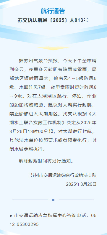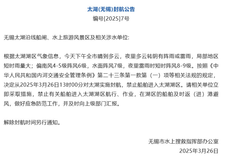 太湖的风雨来得更早,3月26日13时,苏州、无锡对太湖实施封航,禁止船舶进入太湖湖区。3月27日凌晨,苏州出现雷电等强对流天气,偏北风力强劲,水面阵风8级,大风蓝色预警信号继续生效中。截至记者发稿前,太湖尚未解除封航。