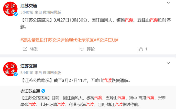 江面风大,长江江苏段多条汽渡临时停航。据@江苏交通,板桥汽渡、五峰山汽渡、扬中—高港汽渡、张皋—皋张汽渡、七圩—圩塘汽渡、利港—夹港汽渡、江阴—靖江、通沙汽渡、崇海汽渡、太海—海太汽渡等临时停航。