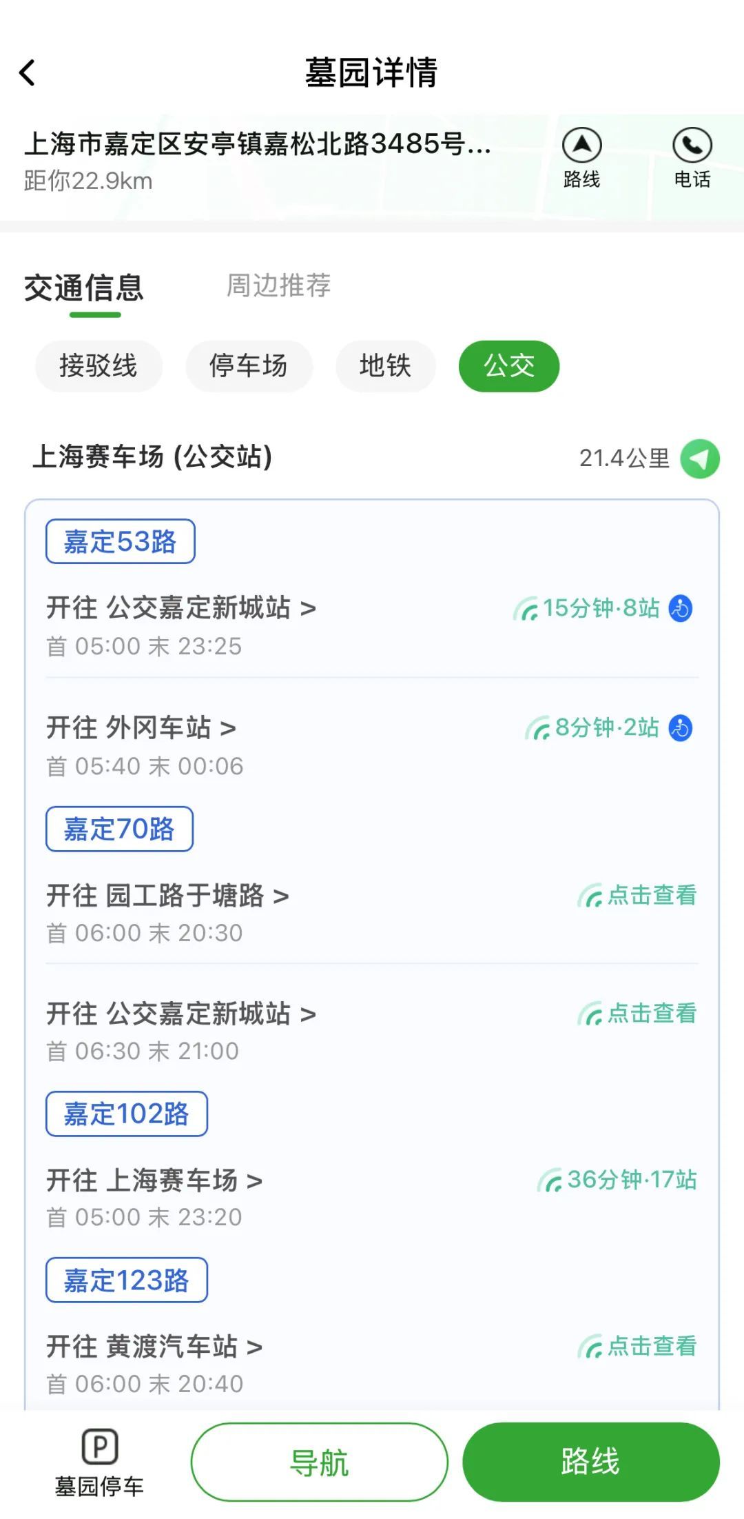 自驾用户:点击墓园详情页下方“导航”,轻松规划自驾行程。再至“交通信息”—“停车场”提前获悉周边车位实时余量、收费标准等信息,导航直达,告别停车烦恼。