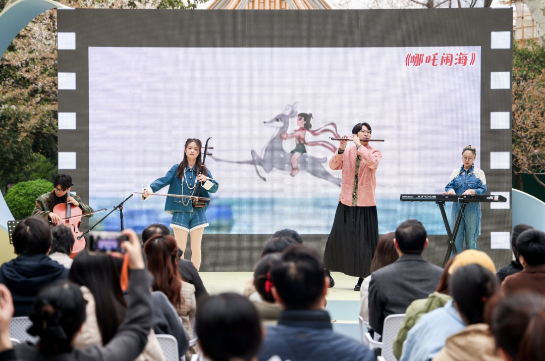 春日的襄阳公园,繁花似锦,在公园广场上,数十幅记载了上海电影历史的电影海报吸引了不少观众驻足。听一段电影音乐,了解音乐之于电影的意义与作用;阿卡贝拉电影歌曲串烧让观众秒回光影世界,重温当时记忆;从《大闹天宫》到《白蛇:缘起》,精彩的器乐演奏生动展现了动画电影音乐的技术演变。