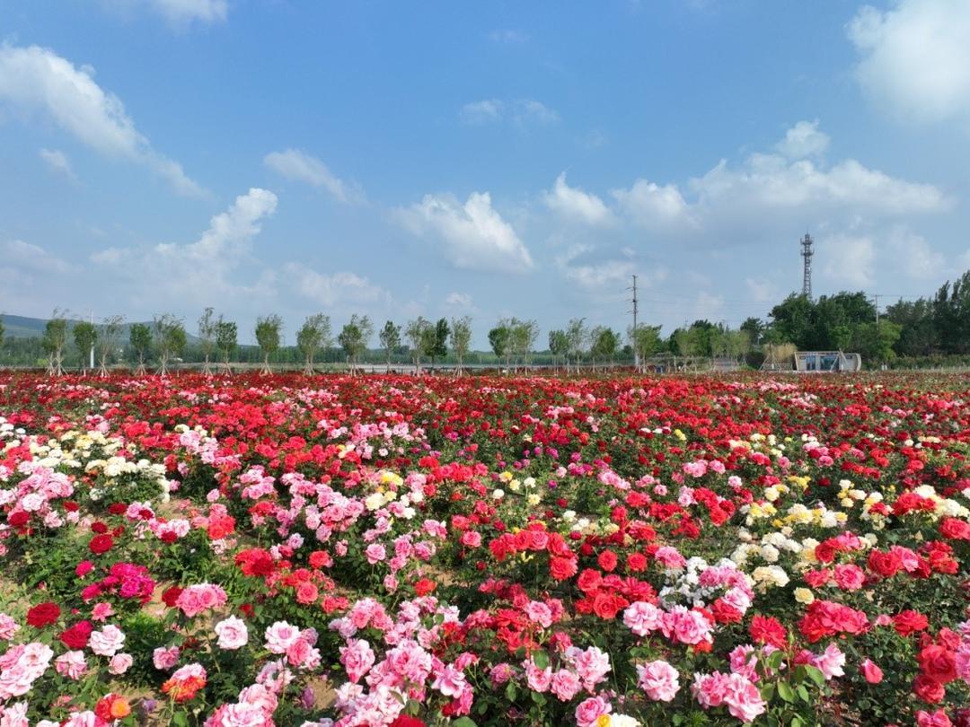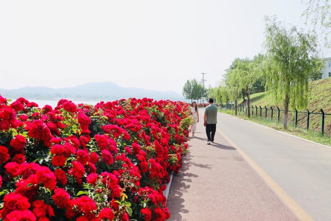 九龙湖坐落在昌乐丹河流域,是昌乐近郊第一大水域,山水相映的生态环境优势得天独厚。打造该区域既是生态环境提升的需要,更是发挥山水优势推动区域文旅产业发展、拉动乡村振兴的重要举措。2022年,昌乐在九龙湖西岸规划打造花海,共栽植月季等观赏性高、景观效果好的花卉约40万株,这些花卉的花期持续六个月,真正实现了“一月一茬花,花色十几种”。放眼望去,五彩斑斓的花海与微波粼粼的湖水融为一体,美不胜收。