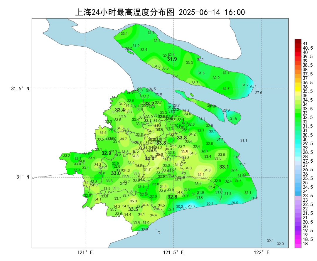 不同于前几天的阴雨天,今天阳光上岗了。申城上午多云到阴为主,气温是给点阳光就灿烂,徐家汇站最高33.8℃,体感闷湿难受,这也是今年入梅以来最热的一天。午后受对流云团东移影响,闵行区气象台11时55分发布雷电黄色预警信号,全市大部分地区出现雷阵雨天气,雨水分布不均,主要集中在金山、奉贤和浦东等地。
