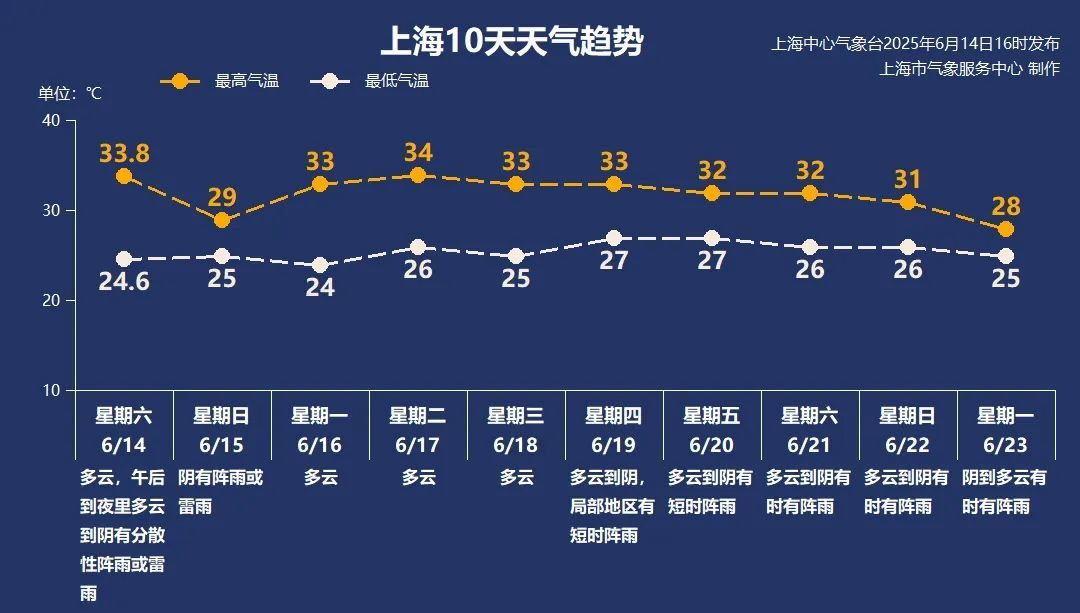 下周初,副热带高压加强北抬,上海将迎来三天左右多云天气,气温明显回升,预计下周初的最高气温维持在33—34℃。大家出门做好防晒,多多补充水分,也可抓紧洗晒,毕竟周四起申城又将多阵雨天气,最高气温略有下降,体感湿热。