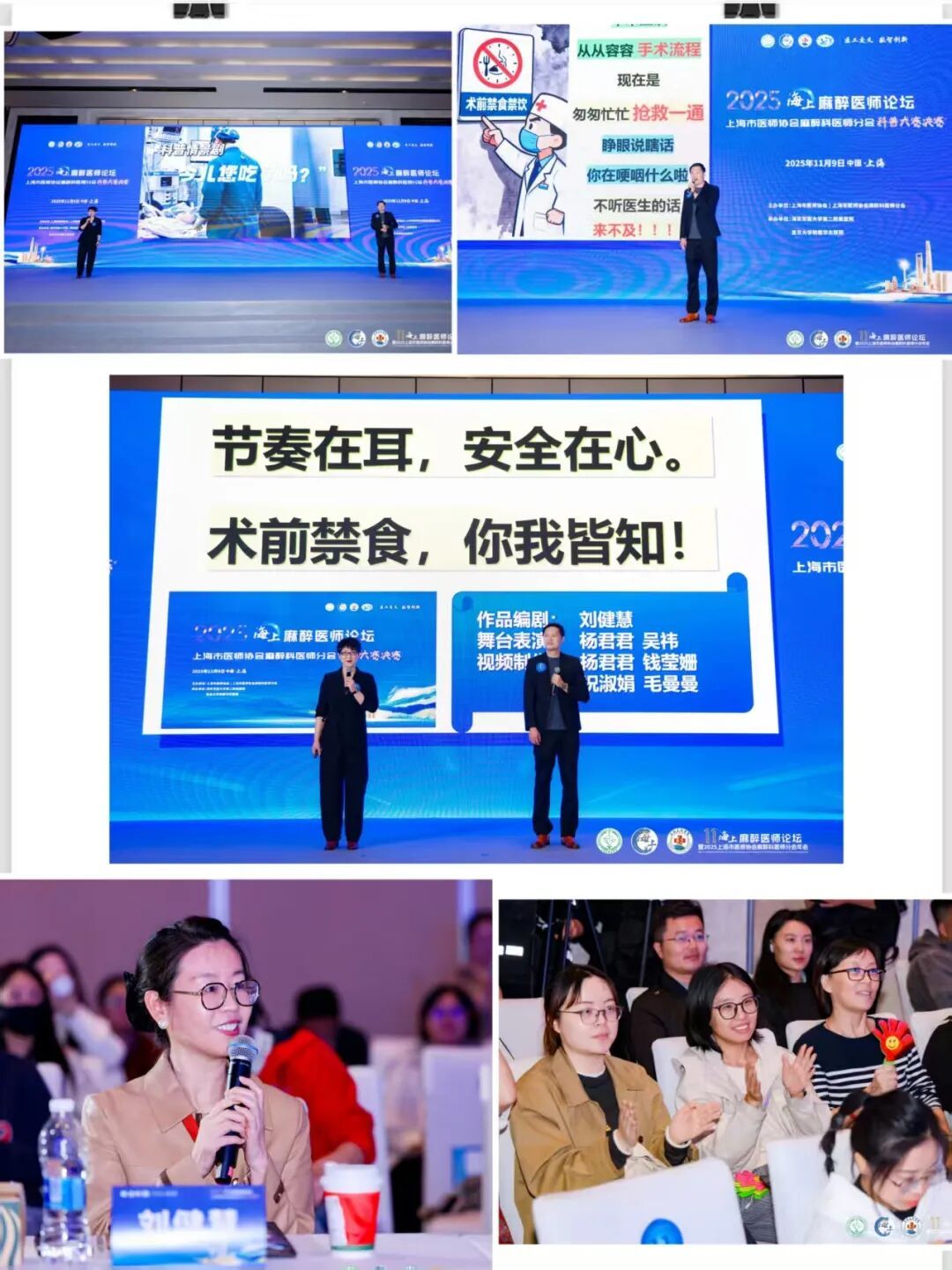 另一支参赛团队创新采用"视频+现场音乐科普口诀"的多元表现形式,以《今儿您吃了嘛?》为主题,生动科普术前禁食的重要性。该作品由主任医师刘健慧担任编剧,副主任医师杨君君负责舞台表演,麻醉护理团队钱莹姗、祝淑娟、毛曼曼共同完成视频制作。特别值得一提的是,作品特邀市民吴先生参与,通过朗朗上口的旋律清唱术前禁食时间表,实现了医学知识在普罗大众中的有效传播。作为当天最后一支参赛队伍,2位参赛者顶住压力,在舞台上喊出"节奏在耳,安全在心。术前禁食,你我皆知"的响亮口号,用轻松愉快的方式传递严肃的医疗安全知识,为整场比赛画上了圆满的句号。 两支参赛团队独具匠心的表演形式,将专业的麻醉知识转化为生动有趣的科普作品,赢得现场观众阵阵掌声。