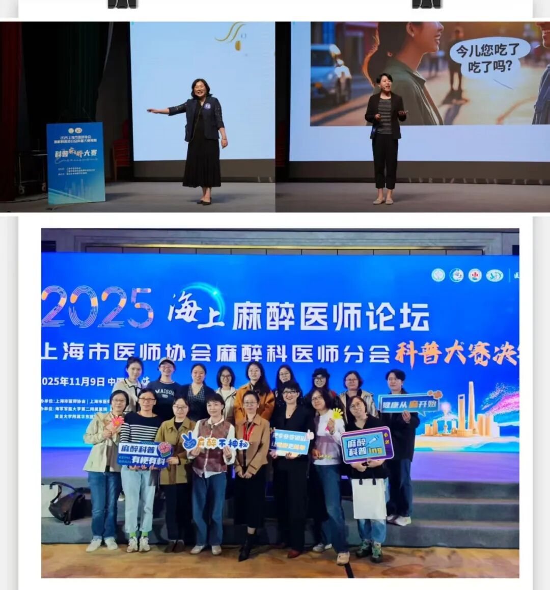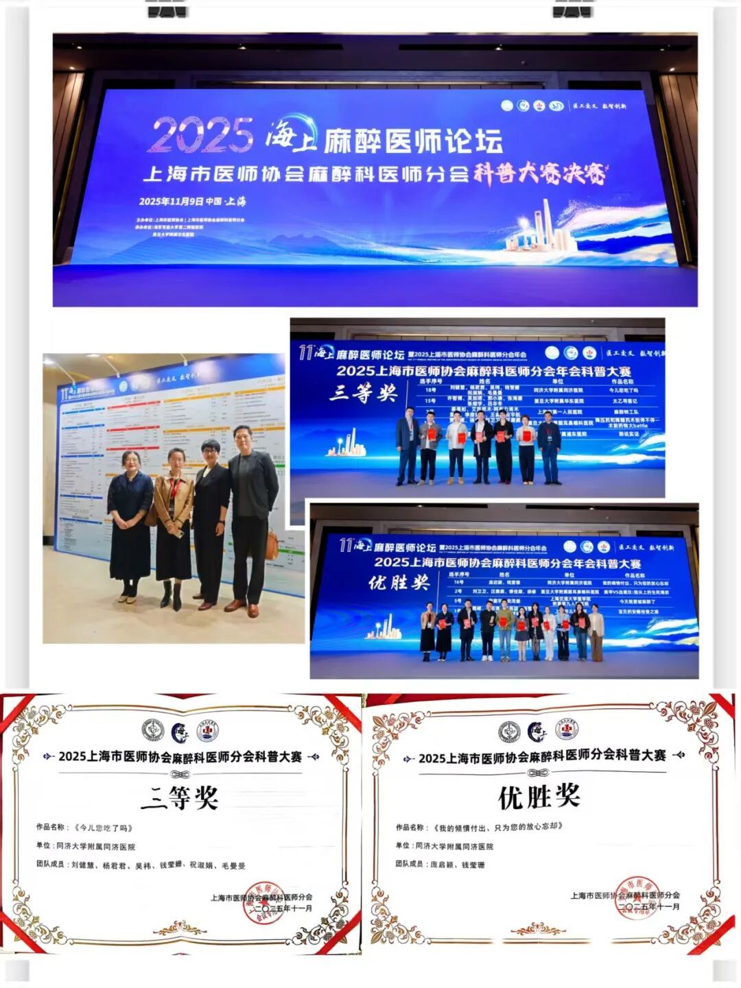 在2025年上海市医师协会麻醉科医师分会科普大赛中,同济医院麻醉科两支团队凭借出色的创意与稳定的发挥,先后从预赛脱颖而出,并最终在全市18支决赛队伍中斩获优胜奖和三等奖。 本次科普大赛作为第十一届海上麻醉医师论坛暨2025上海市医师协会麻醉科医师分会年会的重要环节,于11月9日上午在上海举行。大赛设有线上直播通道,让更多观众得以云端共赏这场医学知识与艺术表现完美融合的科普盛宴。