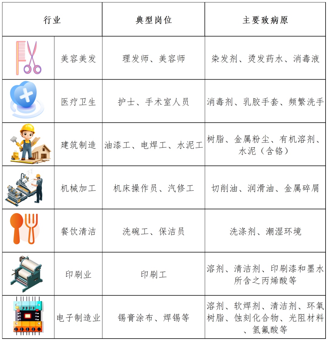 2.高危人群为皮肤屏障弱、过敏体质及防护不足者,高发于美容美发、医疗、建筑等行业,与染发剂、消毒剂等致病原相关。